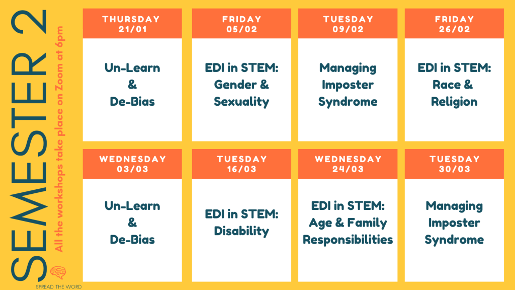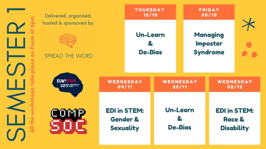 Based on the positive response we received regarding the mentoring scheme and workshop series, and the demand for more workshops, we have expanded the mentoring scheme and the number of participants has already doubled, and we offer the workshops more times within each semester in order to reach more students, increase engagement and achieve maximum effect. The agenda below shows the available workshops to STEM UG and PG students of the University of Edinburgh for Semester 1 and Semester 2. All the workshops are designed and delivered by Dr Athina Frantzana (Spread the Word), and organised, hosted and sponsored by EUWiSTEM and CompSoc.